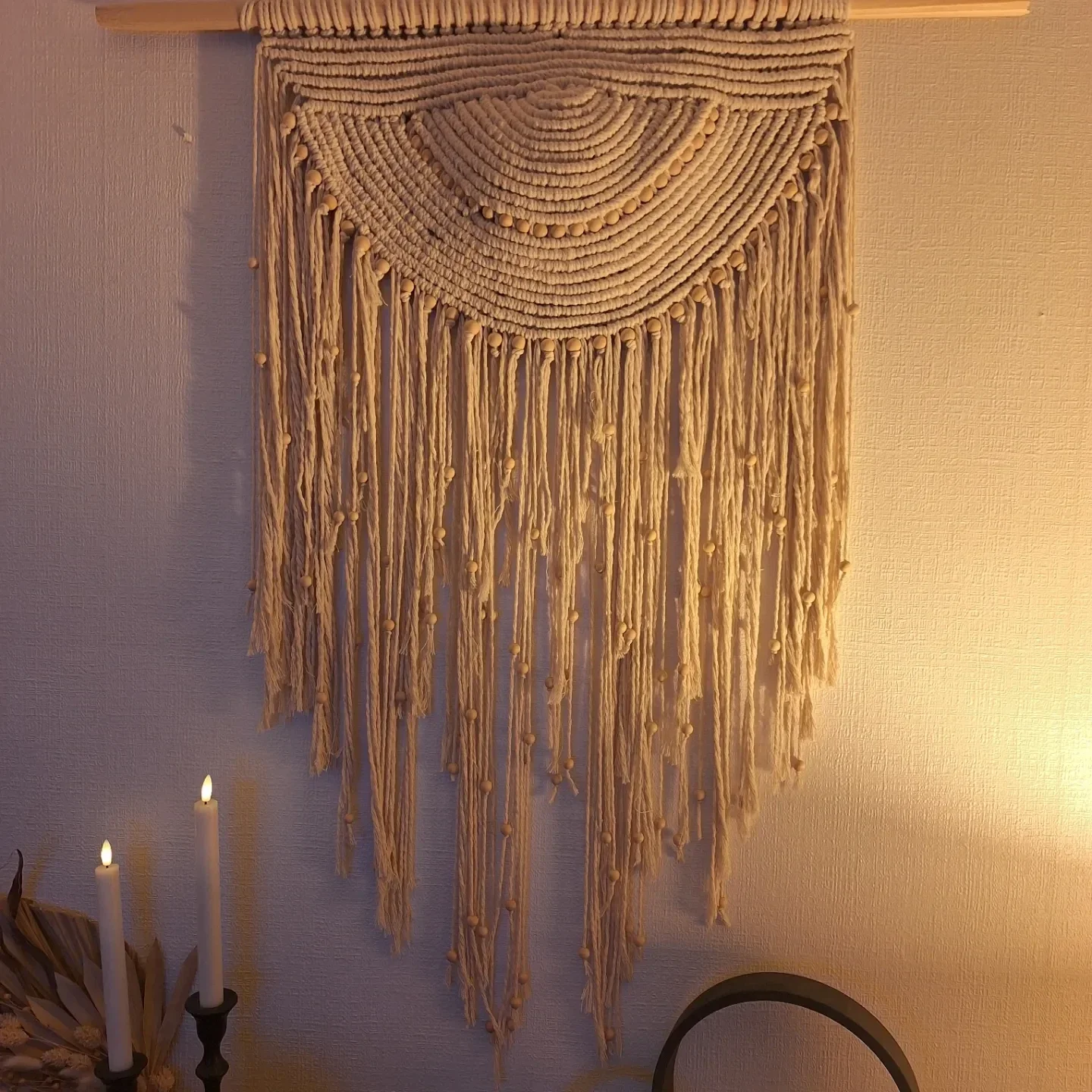 Denne er en av di sjeldne. Tykk 5 millimeters macrametråd av 100% bomull. Dekorert med trekuler. Mere bohemskt en dette får du ikke. Denne buler litt ut i formen og gir den dybde på veggen.