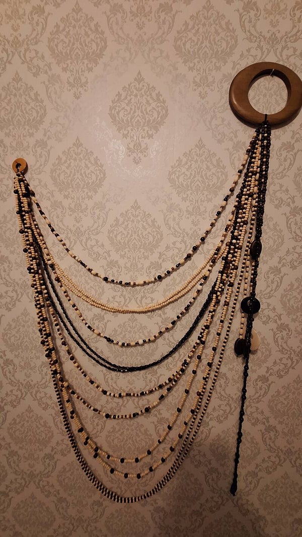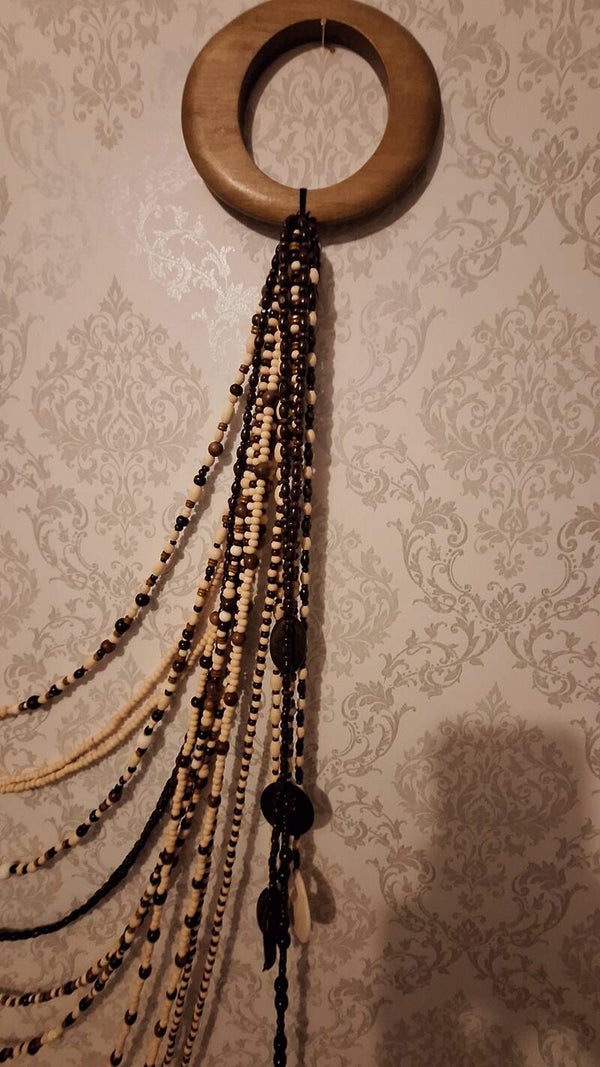 En nydelig trepærle vegg dekor. Med en mix av lyse og brune kuler.